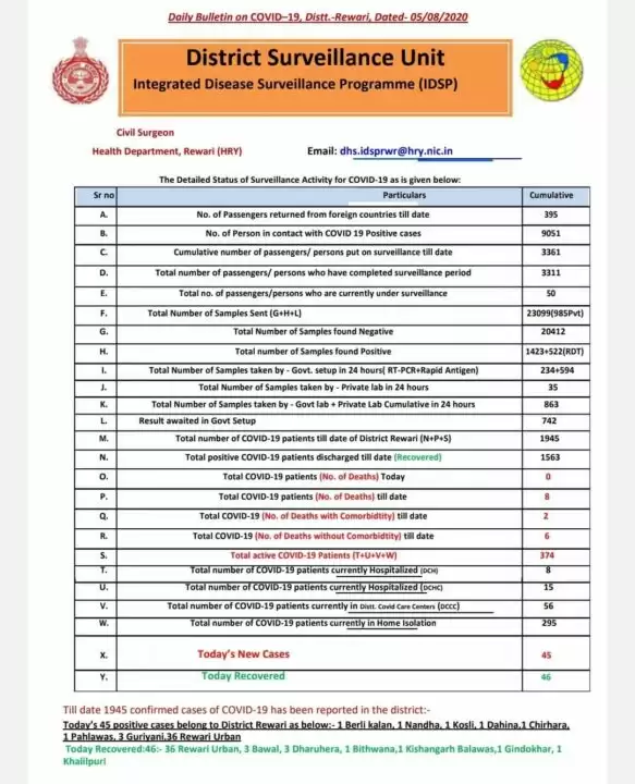 कोरोना अपडेट: आज 45 नए केस , 46 ठीक हुए