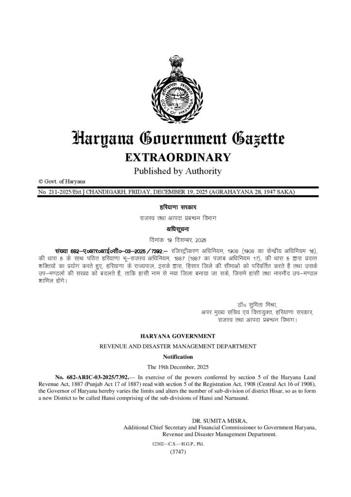 Hansi District: हरियाणा के हांसी जिले की अधिसूचना जारी, देखें 110 गांवों की लिस्ट