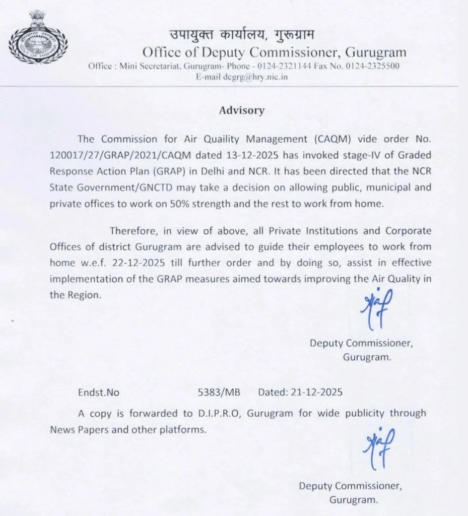 प्रशासन ने साइबर सिटी के निजी संस्थानों और कॉरपोरेट ऑफिसों से अपील की है कि वे 22 दिसंबर 2025 से अपने कर्मचारियों को वर्क फ्रॉम होम प्रदान करें। CAQM के निर्देशों के तहत निजी कार्यालयों को 50 प्रतिशत क्षमता के साथ संचालित करने का सुझाव दिया गया है। डीसी अजय कुमार ने स्पष्ट किया कि यह कदम वायु गुणवत्ता में सुधार और कर्मचारियों के स्वास्थ्य की रक्षा के लिए उठाया गया है।
